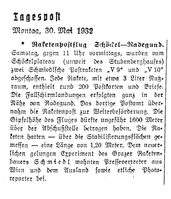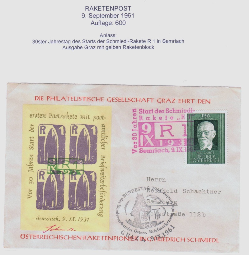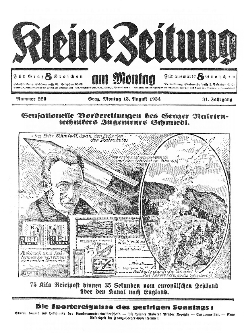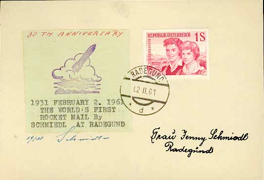 Am 2. Februar 1931 startete der Chemiker und Bauingenieur Friedrich Schmiedl, der aus Niederösterreich kommend sich nach seinem Studium an der Technischen Universität in Graz niedergelassen hatte, die erste Versuchs-Postrakete mit 102 Poststücken in 1.500 Metern Höhe vom Schöckl aus nach St. Radegund; im Lauf seines Lebens sollten es mehr als 3.300 Postschüsse, Kleinraketen und Raketenversuche werden.